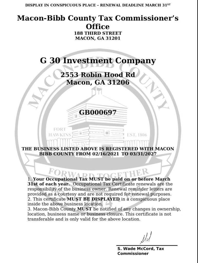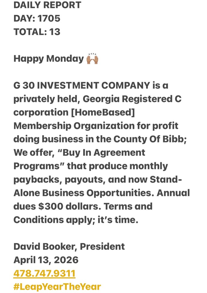G 30 INVESTMENT COMPANY is a privately held, Georgia Registered C corporation [HomeBased] Membership Organization for profit doing business in the County Of Bibb; We offer, “Buy In Agreement Programs” that produce monthly paybacks, and payouts that generate monthly income, wealth, loans, opportunities, and privileges; annual dues $300 dollars. Terms and Conditions apply; text 478.747.9311 for more information.